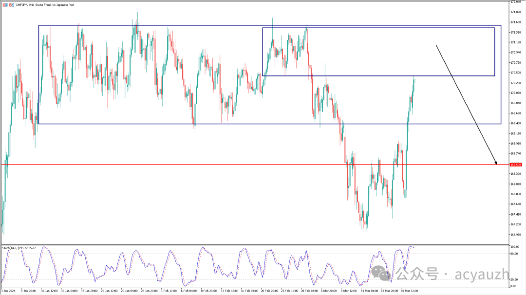 在货币中最弱的要属瑞郎,因此看空瑞日货币对便是较好的配对。从瑞日四小时图来看,瑞日又回到了头部震荡区域,上涨动能强劲,暂时未受阻碍。空单想要入场还需要耐心等待头部成型。现价上方的关键阻力集中在170.5-171.5关口,入场时机尽量配合左侧指标。目前随机指标已经出现死叉形态,一旦开口扩大,便是空头入场的信号。下方的短线支撑在168.5和167两个位置。