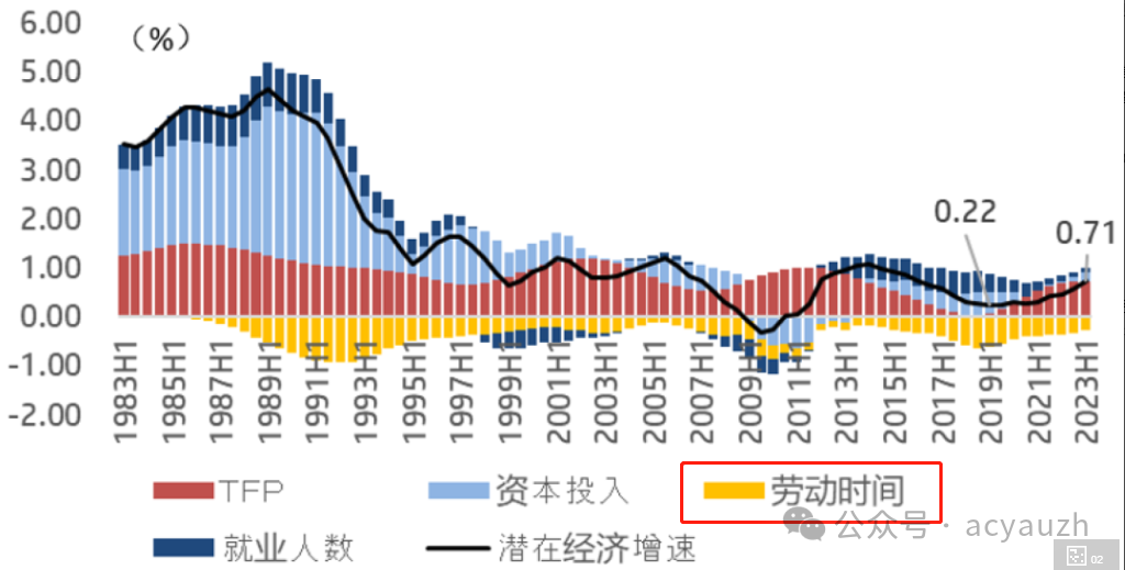 导致日本经济长年低迷的一大原因,是过去30多年里日本人的平均劳动时间持续下滑。由图可见,日本的全要素生产率TFP(科技水平)是经济发展的关键推力,而日本的就业比例已经达到历史最高水平,同时在央行退出ETF购买计划后,资本的投入速度也将放缓。日本经济复苏的最大希望便落在了劳动时间上。