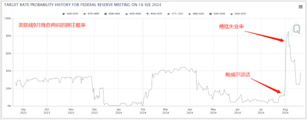 不过就在鲍威尔讲话那周五,美国发布了就业报告,表现全面不佳,尤其是失业率从4.1%跳涨至4.3%。可以说,狠狠打了鲍威尔的脸,就业市场并没有他说的那么强劲。这个消息也让金融市场为之动荡,大大提高了9月份降息两码的概率。这也让市场非常关注,鲍威尔今晚的讲话中是否会对“曾拒绝过”的50基点降息持开放态度。