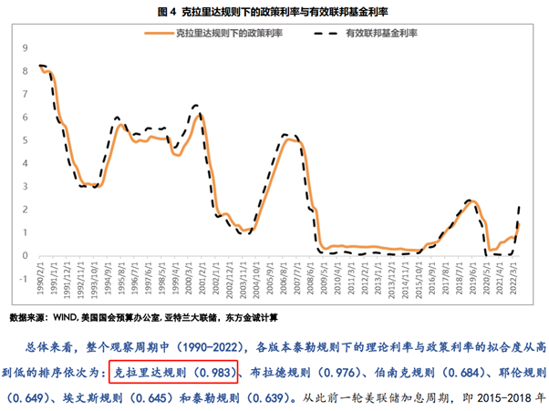 目前西方国家央行在制定利率时主要采用泰勒公式的变种——克拉里达公式。由图可见,通过该公式计算出来的利率指引与实际利率几乎完全相同。也就是说,如果克拉里达公式说美联储要加息50基点,那么美联储便很可能作出这样的决策。