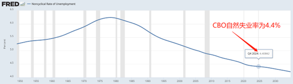 不仅如此,一般美联储只有在失业率高于CBO自然失业率的时候才会关心就业萎靡。而目前的CBO自然失业率是4.4%,高于当前4.3%的实际失业率。美联储对就业强劲的描述其实并没有错。