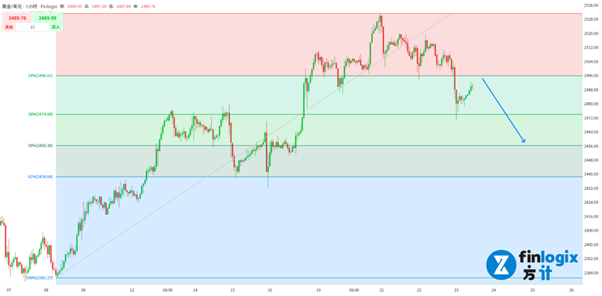 从黄金一小时图来看,金价跌破了2495的头部颈线与斐波那契回调线,在触及到前高点水平线与回调线时开始反弹。考虑到黄金和美股一样存在超涨压力,交易策略可以采用回踩做空的方式,阻力在颈线2495-2500区间。可以配合鲍威尔的鹰派讲话,高位做空。现价下方的支撑分别在回调线2475和2460位置。鲍威尔的讲话暂时难以让黄金开启下跌趋势。