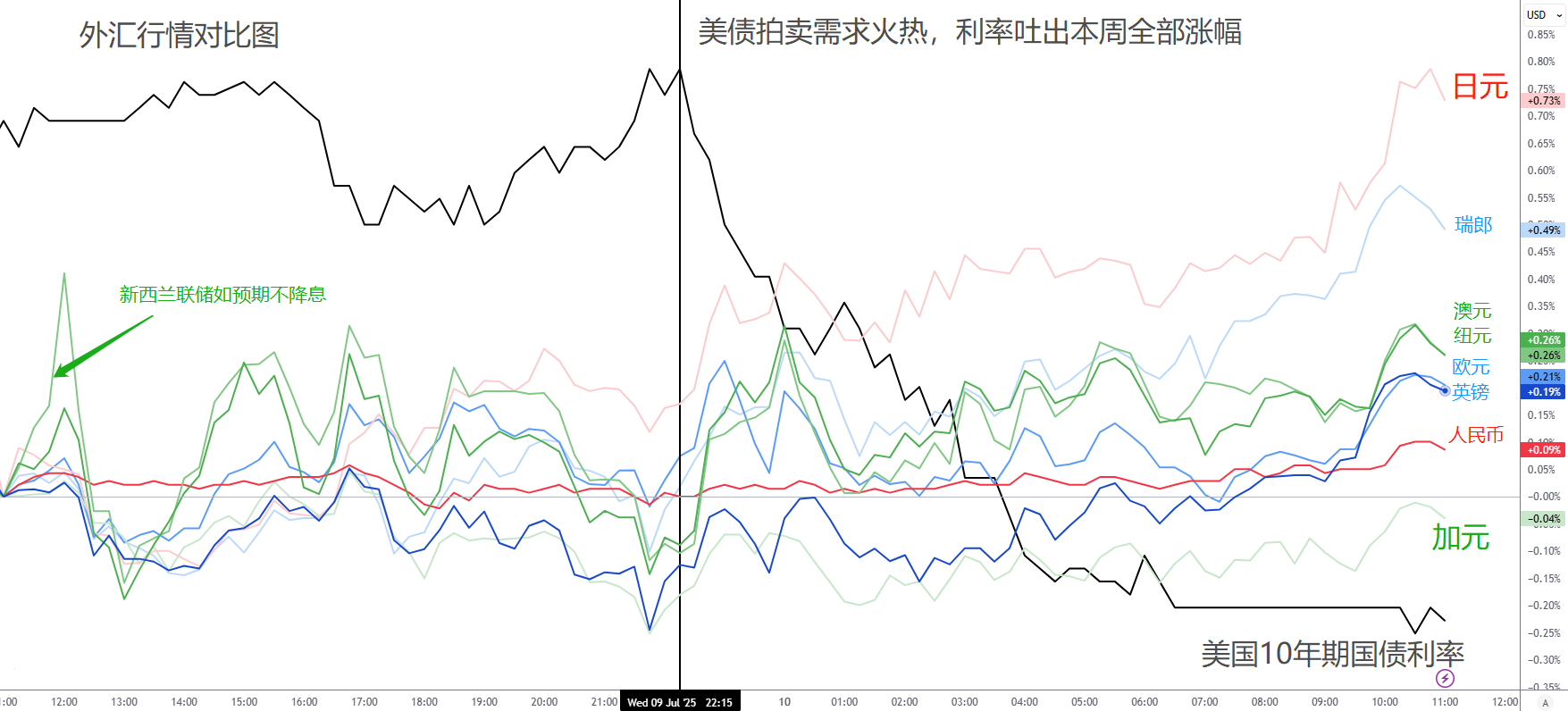 日元与瑞郎:受到美债利差影响较大,因此在美元(美债利率)下跌时,日元与瑞郎表现最佳。