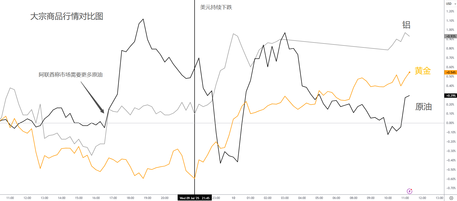 黄金和铝:美元的下跌对大宗市场有利好,因此金属价格普遍在美盘时段持续上涨。