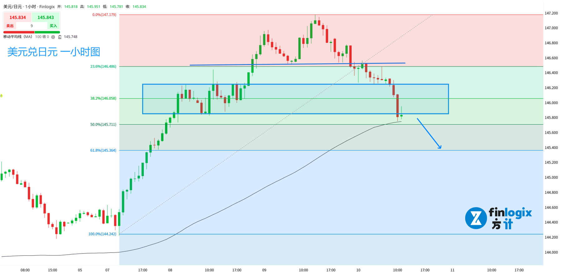 技术面:100均线向上但出现拐点,空单仍需要设好止损。美日不仅形成了头部反转结构,还跌破了前方的中继形态,空头力量较强。交易策略以跟随做空为主。目标位置参考斐波那契0.618回调线。