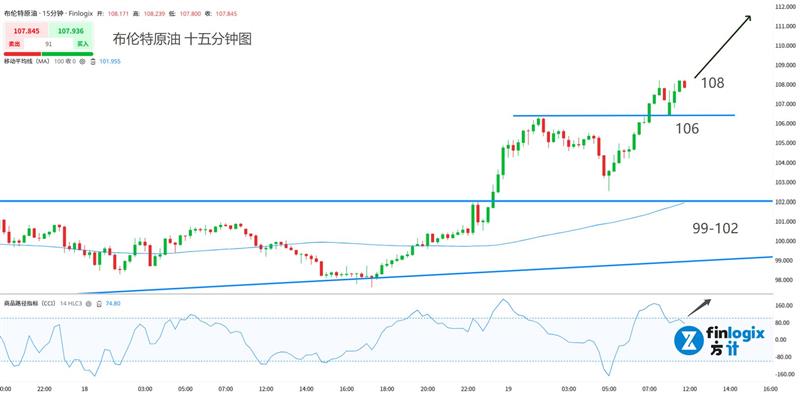 技术面:100均线向上,消息面动能强劲。日内交易策略以顺势跟涨为主,配合CCI上穿+100线看涨,回到中心区域离场。但如果跌破106,可能受到消息面利空,需要及时止损。等待价格回到底部支撑再行布局。