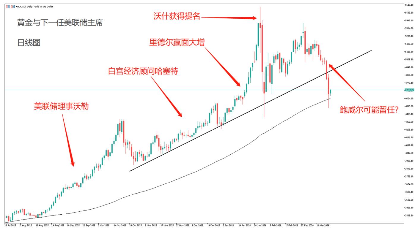 如果美联储如市场预期那样加息,黄金价格恐将遭受新一轮重创。去年金价的剧烈拉升,很大程度上锚定了一个市场预期:新任美联储主席将在特朗普施压下大幅降息。沃勒、哈塞特与里德尔三人均是力挺特朗普的鸽派人选,每当他们在Polymarket上的胜率走高,金价便随之飙涨。直到所谓"鹰派"的沃什获得提名,金价才见顶回落。上周美联储新闻发布会上,更强硬的现任主席鲍威尔可能"连任"的消息再度震动市场——金价随即跌破关键趋势支撑,下行趋势就此确立。