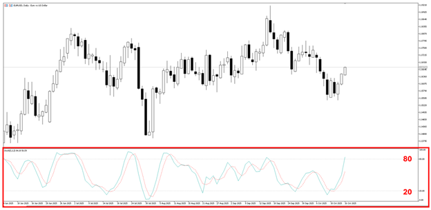 图中有两条水平线——上方的 80 线代表超买,下方的 20 线代表超卖。