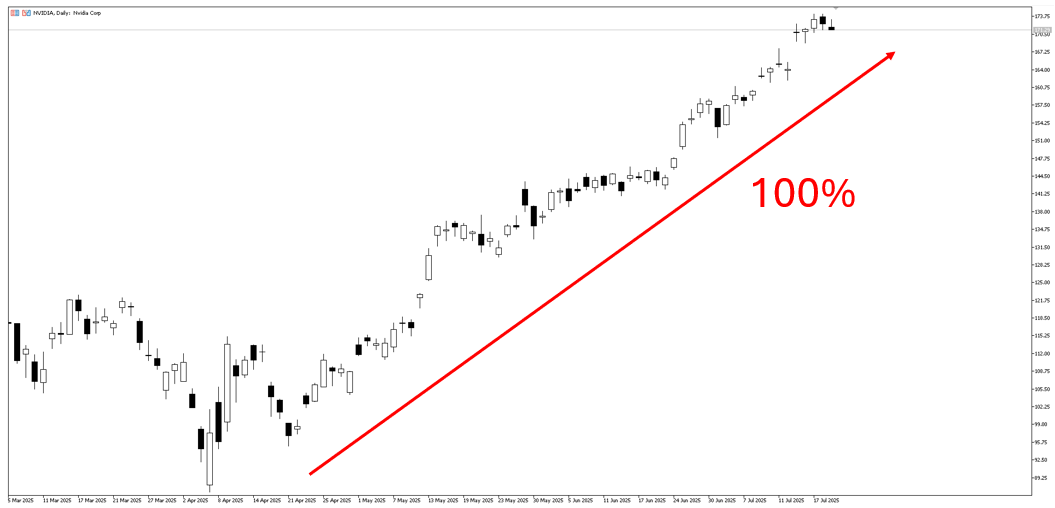 如果你喜欢做多强势股,下面这张 英伟达(NVIDIA) 的 MT5 图表一定会让你惊艳——在 2025 年4月到7月的期间,英伟达股价暴涨 100%,走势极为强劲,成为今年最亮眼的趋势之一。