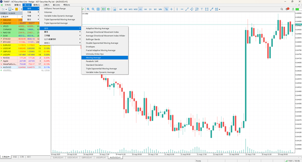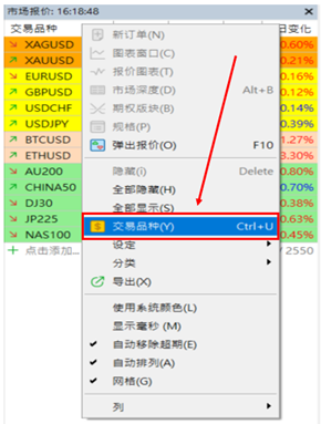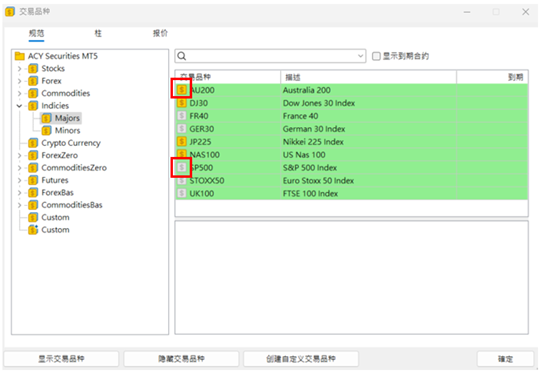 2. 若想查看 ACY证券提供的完整交易品种清单:在「市场报价(Market Watch)」窗口中点击右键→ 选择「交易品种」