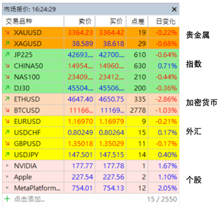 你可以快速添加外汇、股指、加密货币(如比特币)、大宗商品(黄金、白银)以及股票差价合约(如纳斯达克 CFD)。