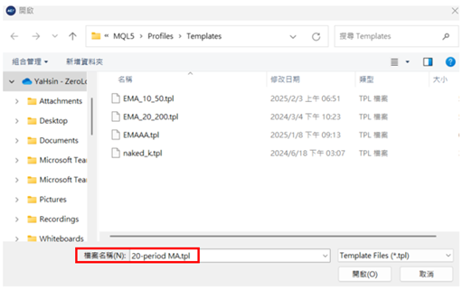 4. 在图表上右键 → 模板 → 保存模板,为其命名(如「20-period MA」)