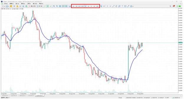 MT5 提供从 1 分钟到 1 个月的多种周期,只需点击顶部的周期按钮即可快速切换。