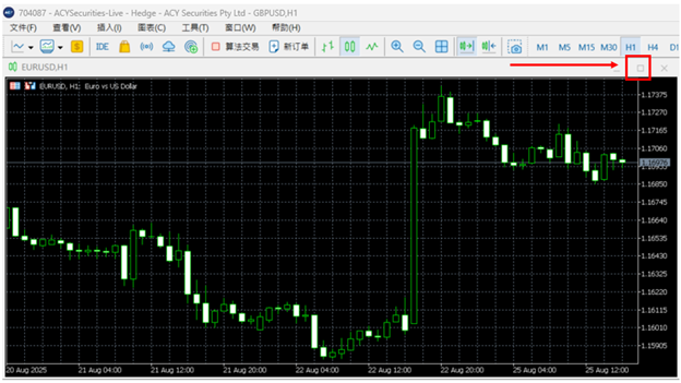 1.最大化 EURUSD 图表窗口,点击右上角的“最大化”按钮。