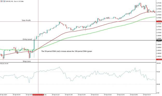 - 买入信号:当50周期EMA(红线)向上穿越100周期EMA(绿线)时出现买入信号。在图表中,该交叉发生在凌晨01:05,EUR/USD价格约为1.06974。